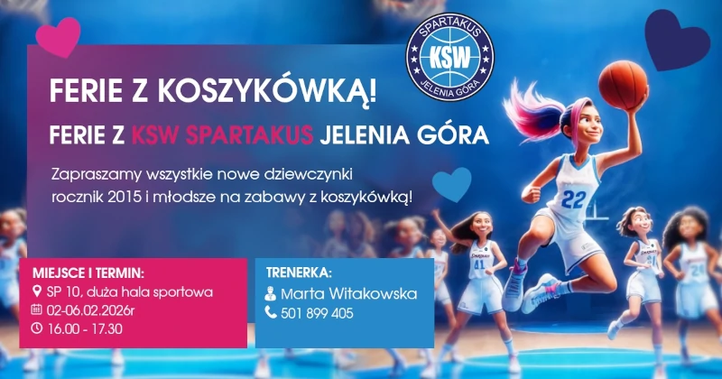 Pierwszy tydzień ferii spędzamy aktywnie razem z KSW Spartakus Jelenia Góra Zapraszamy wszystkie dziewczynki – rocznik 2015 i młodsze na...