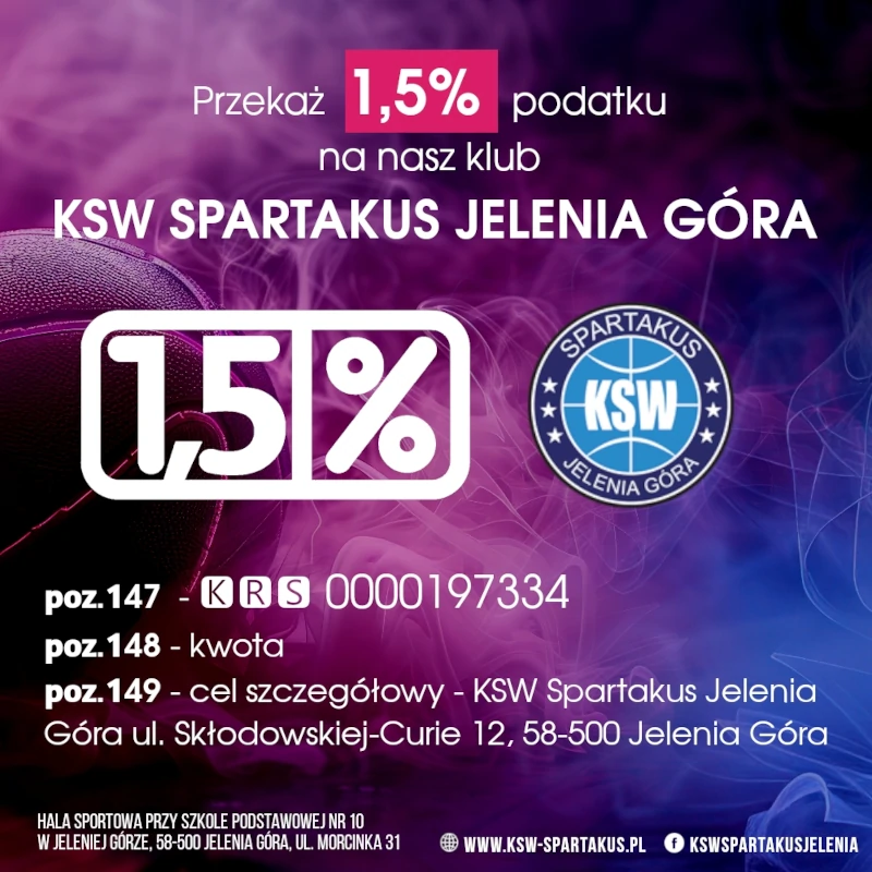 Drodzy Przyjaciele i Sympatycy sportu! Rozliczając swój PIT, możecie realnie wesprzeć rozwój młodych zawodników KSW Spartakus Jelenia Góra. Wasze 1,5%...